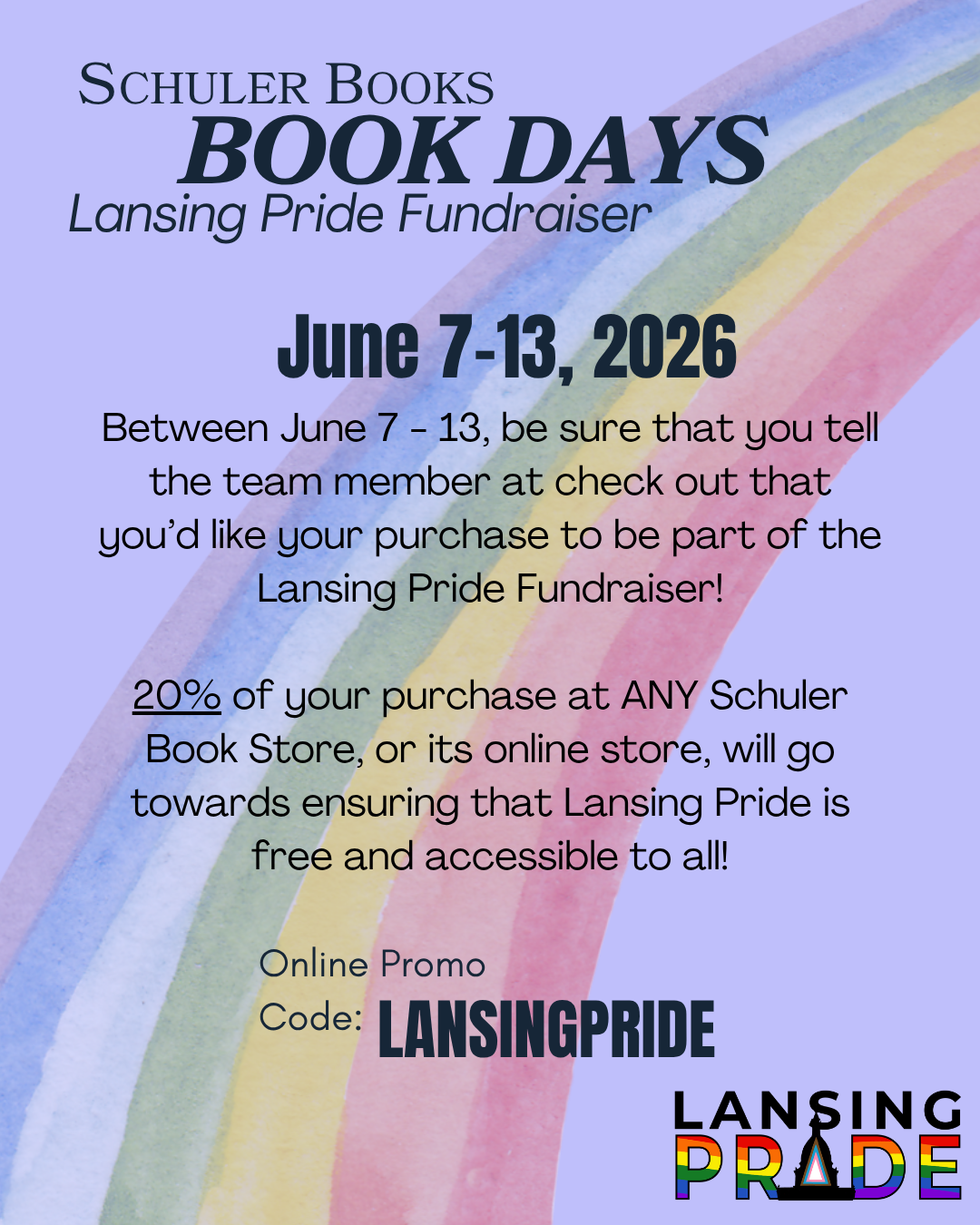 20% of your purchase at ANY Schuler Books Store, or its online store, will go towards ensuring that Lansing Pride is free and accessible to all!